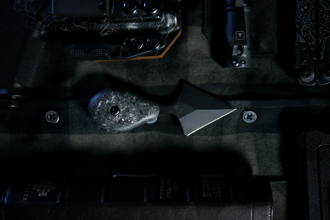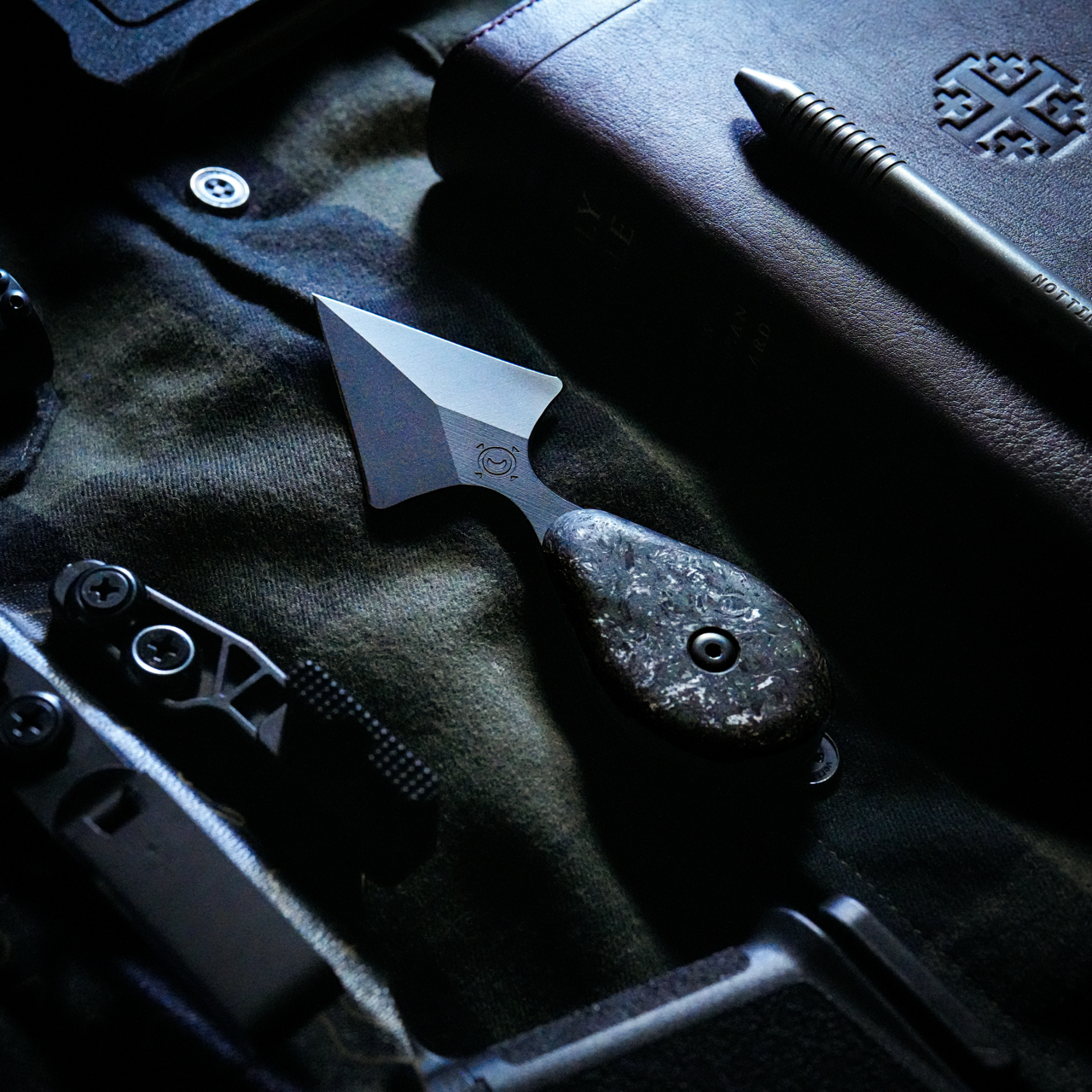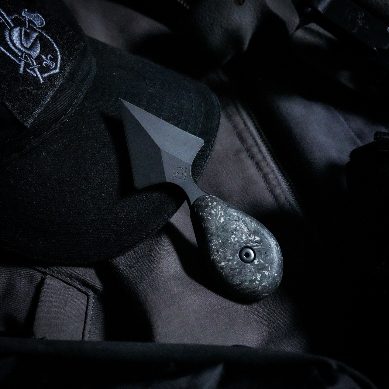 The Broken Arrow is Going Dark Gear's flagship fixed-blade knife - a compact 5-inch marvel with a 2" CPM S45VN American steel dagger blade, arrowhead profile for precision strikes, and Cerakote finish for durability. Its signature ovoid carbon fiber grip molds to the palm for instinctive, hand-filling control, while symmetry ensures ambidextrous ease and low center of gravity maximizes cut precision. Designed by Going Dark Gear and crafted in collaboration with Half Face Blades, this limited edition tool equips discreet protectors to blend seamlessly into life while defending with unwavering conviction.